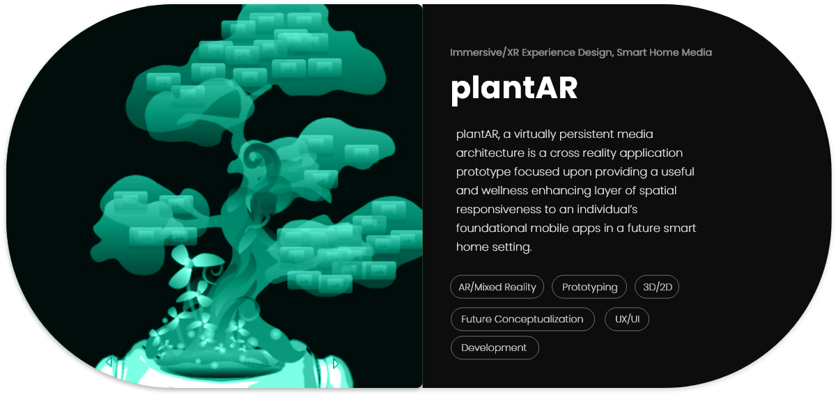 plantAR, a virtually persistent media architecture is a cross reality application prototype focused upon providing a useful and wellness enhancing layer of spatial responsiveness to an individual’s foundational mobile apps in a future smart home setting.